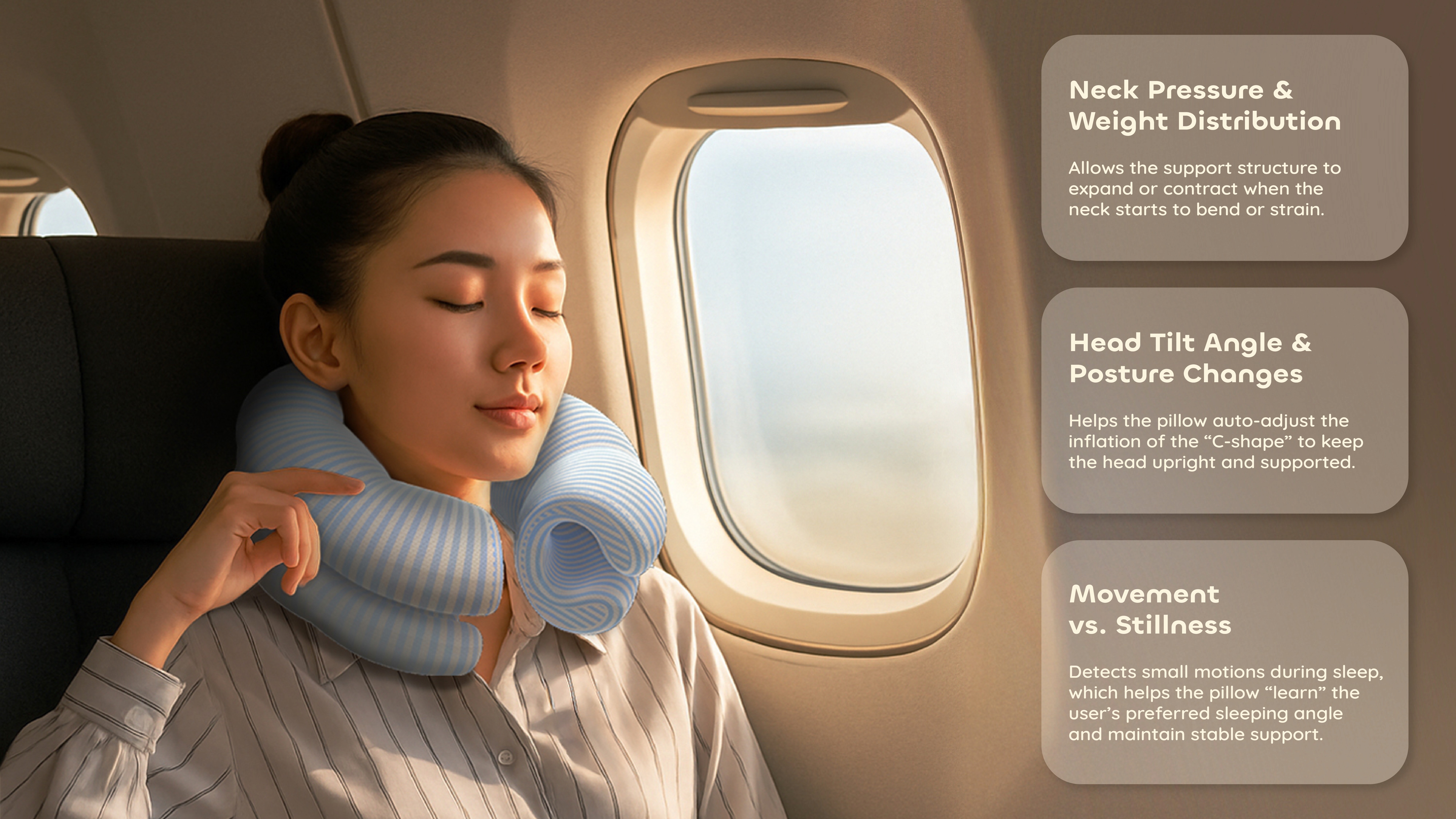 A smart neck pillow designed to solve the current “one-size-fits-all” problem by adapting to different body types, postures, and travel scenarios.