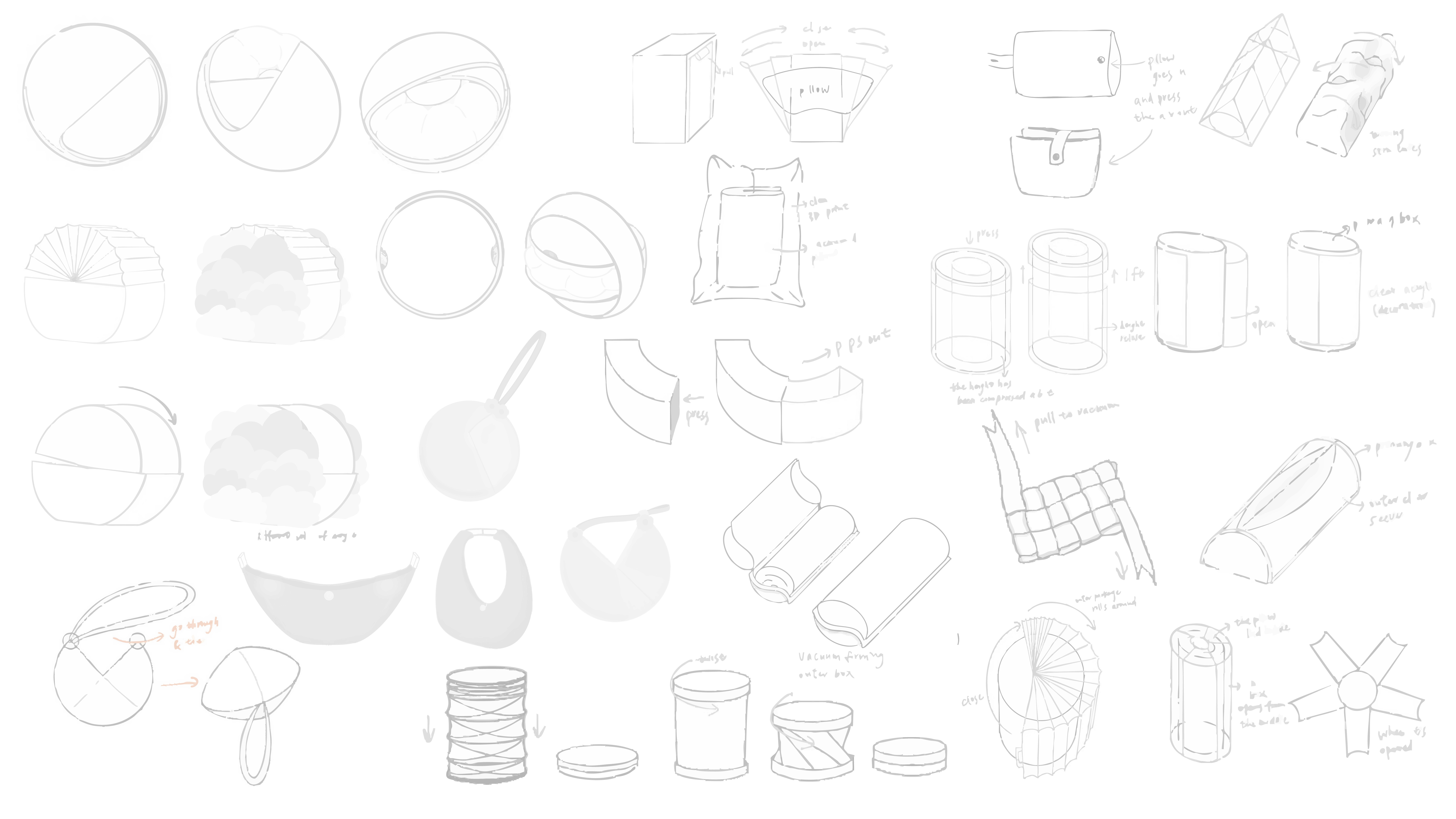 Initially, the packaging exploration focused on reducing the pillow’s volume through compression or transforming it into a reusable carrying pouch to enhance portability during travel.