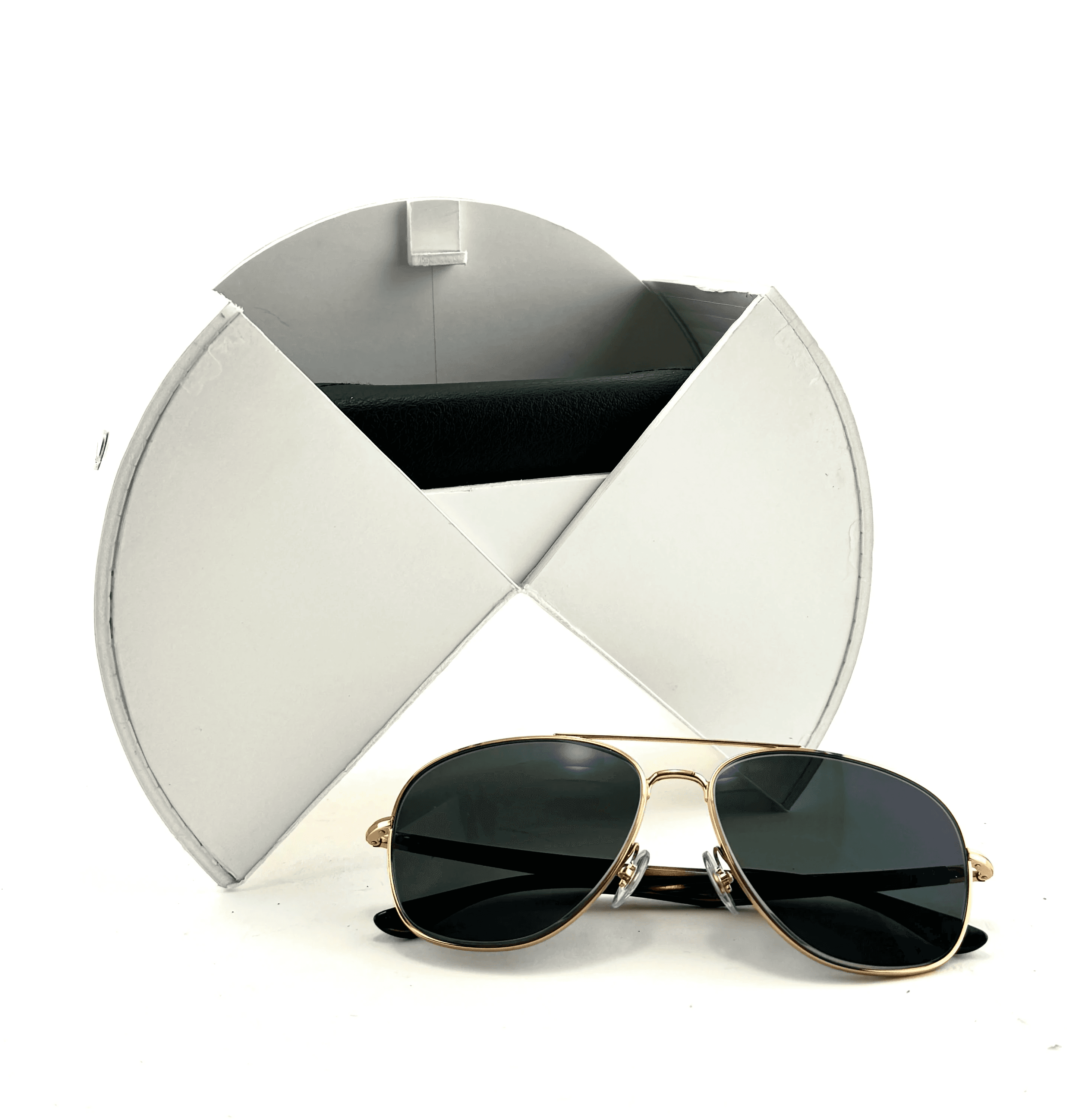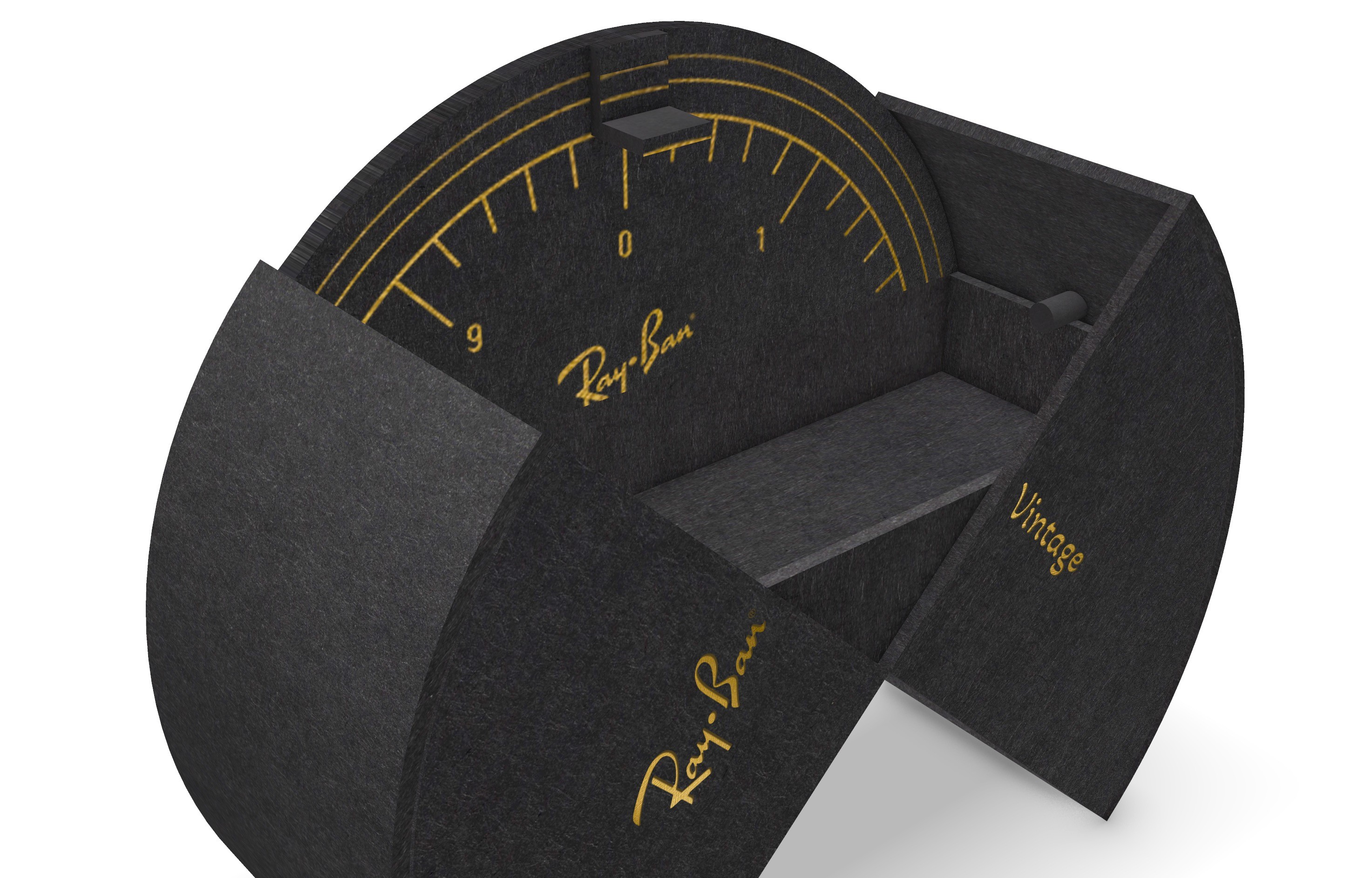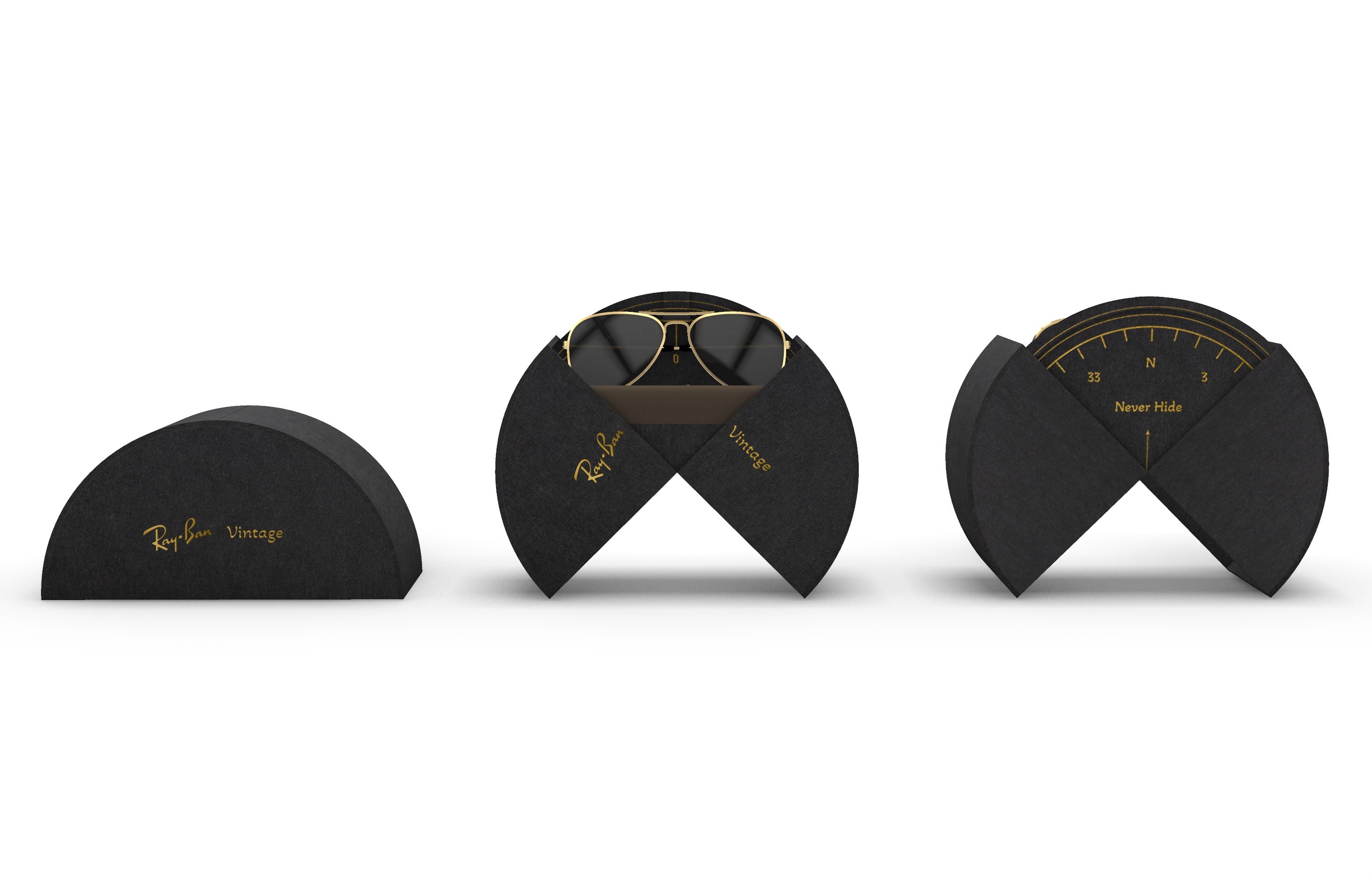 Founded in 1936, Ray-Ban originally developed sunglasses for U.S. Air Force pilots to reduce the intense blue and white glare of the sky. Drawing inspiration from this aviation heritage, this rigid box design incorporates visual elements reminiscent of an airplane’s cockpit dial, celebrating the brand’s origin story. The structural and graphic details embrace a vintage early-1900s aesthetic, referencing precision instruments and mechanical craftsmanship.